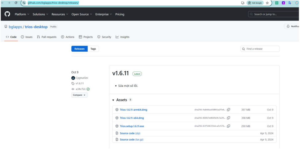 Bước 2. Sau khi tải ứng dụng thành công, người dùng tiến hành cài đặt trên thiết bị của mình. Bước 3. Chờ hoàn tất cài đặt, khởi động ứng dụng và tiến hành đăng ký tài khoản. Trên máy tính windows: Bước 1. Để tải phần mềm, người dùng truy cập đường dẫn https://github.com/bglapps/trios-desktop/releases/ và chọn phiên bản cài đặt định dạng đuôi “.exe” mới nhất bên cạnh có chữ latest, ví dụ: