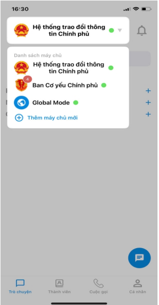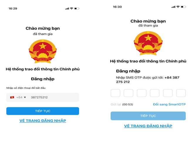 2. Đăng nhập vào máy chủ Hệ thống trao đổi thông tin Chính phủ Bước 1. Tại màn hình ứng dụng, nhập số điện thoại cá nhân để đăng ký tài khoản Bước 2. Chọn mã vùng tương ứng với số điện thoại đang có và nhấn nút [Tiếp tục] Hệ thống gửi mã SMS OTP đến số điện thoại của người dùng để xác nhận. Bước 3: Nhập mã OTP tại form và nhấn nút [Tiếp tục] Hệ thống đăng nhập thành công vào tài khoản máy chủ Hệ thống trao đổi thông tin Chính phủ. Người dùng có thể dùng tài khoản này liên lạc với người dùng khác đang sử dụng.