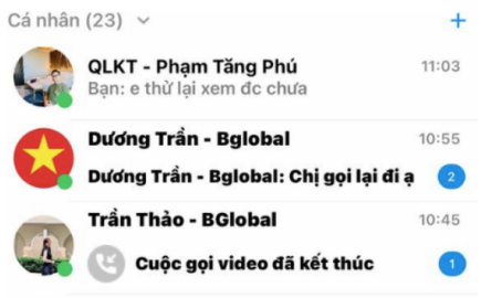 - Đối với cuộc hội thoại cá nhân, sau khi xoá thì thông tin cuộc hội thoại sẽ không hiển thị ở màn hình danh sách, nội dung cuộc hội thoại sẽ bị xoá, người dùng vẫn có thể tìm kiếm thông tin người dùng để tiếp tục cuộc hội thoại nhưng sẽ không còn nội dung trao đổi trước đó.