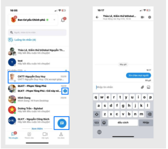 IV. Cuộc hội thoại 4.1 Gửi tin nhắn đơn/ nhóm Chức năng cho phép người dùng gửi tin nhắn trong các cuộc trao đổi công việc đơn hoặc trò chuyện nhóm nhiều người Bước 1. Tại màn hình danh sách, click biểu tượng [+] ở đầu danh sách hội thoại, hoặc chọn biểu tượng “Tin nhắn” ở dưới cùng màn hình app, tìm kiếm tên một người bạn muốn gửi tin. Bước 2. Để gửi tin nhắn trên, bạn chỉ cần: Gõ nội dung tin nhắn và bấm Gửi.
