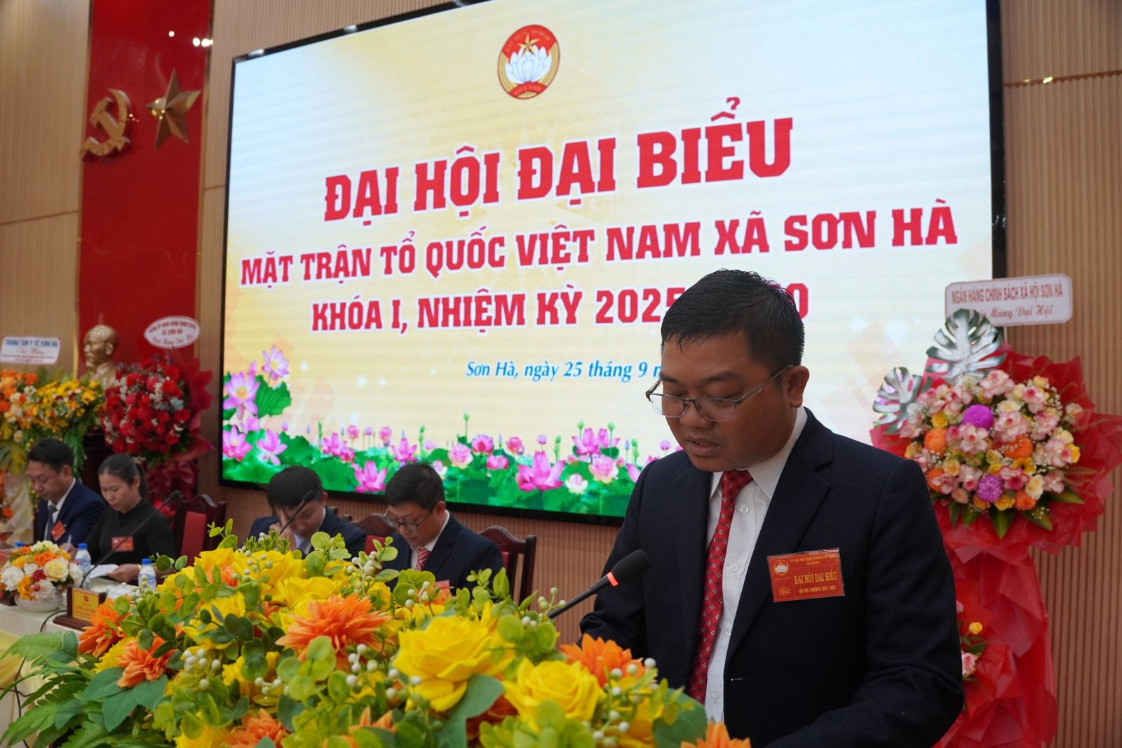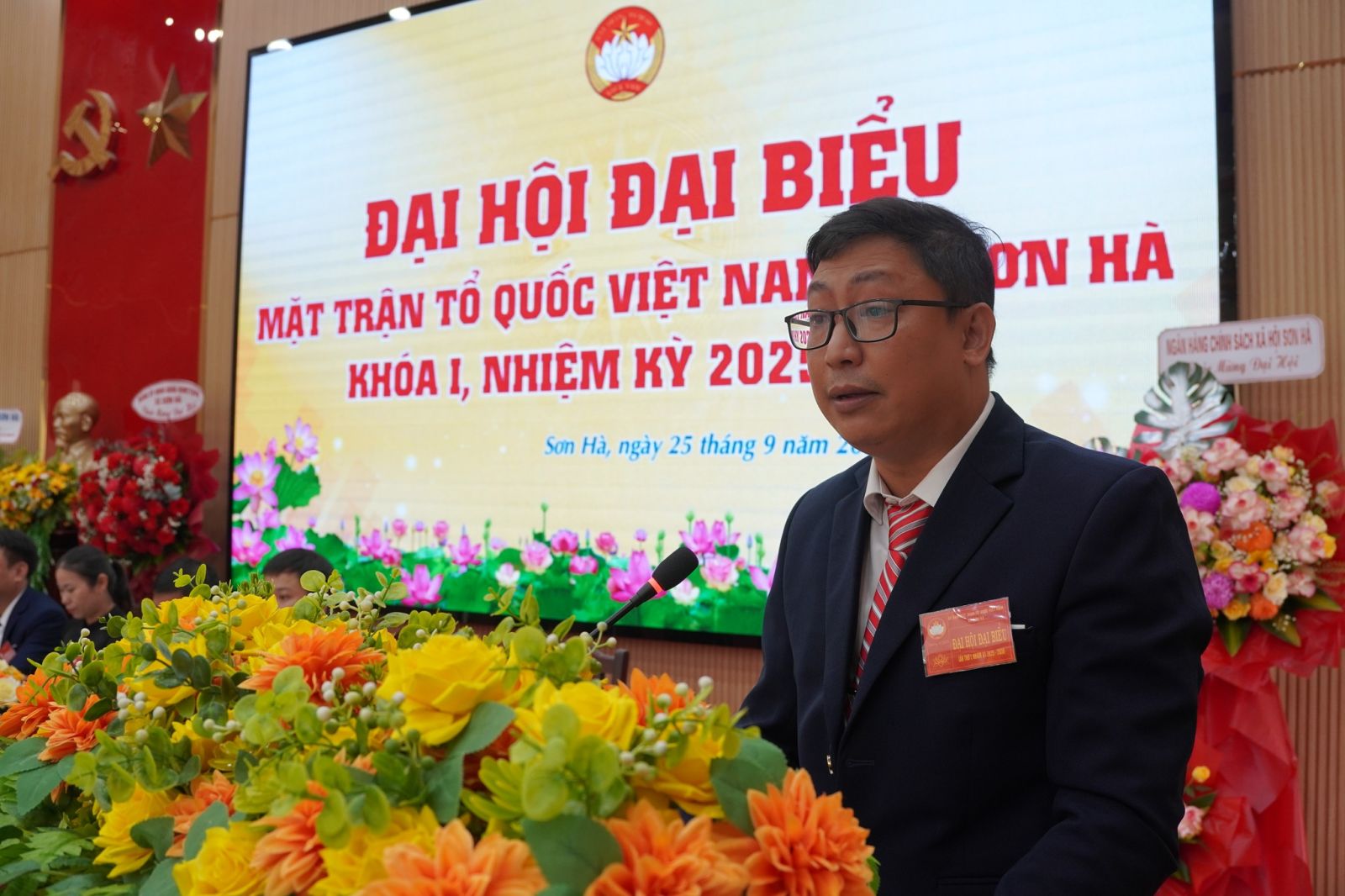 Phát biểu chỉ đạo tại Đại hội, Phó Bí thư Thường trực Đảng uỷ xã Sơn Hà Đinh Trường Sơn; yêu cầu, MTTQ các cấp phát huy vai trò đại diện, tập hợp, phản ánh kiến nghị của Nhân dân đến các cơ quan Đảng, chính quyền; đồng thời, đôn đốc, giám sát việc xử lý, giải quyết các kiến nghị của Nhân dân. Đặc biệt, chăm lo, bảo vệ quyền, lợi ích chính đáng của Nhân dân theo phương châm “Ở đâu có Nhân dân thì ở đó phải có Mặt trận”; đổi mới mạnh mẽ nội dung và phương thức hoạt động; ứng dụng công nghệ thông tin, chuyển đổi số trong công tác Mặt trận…