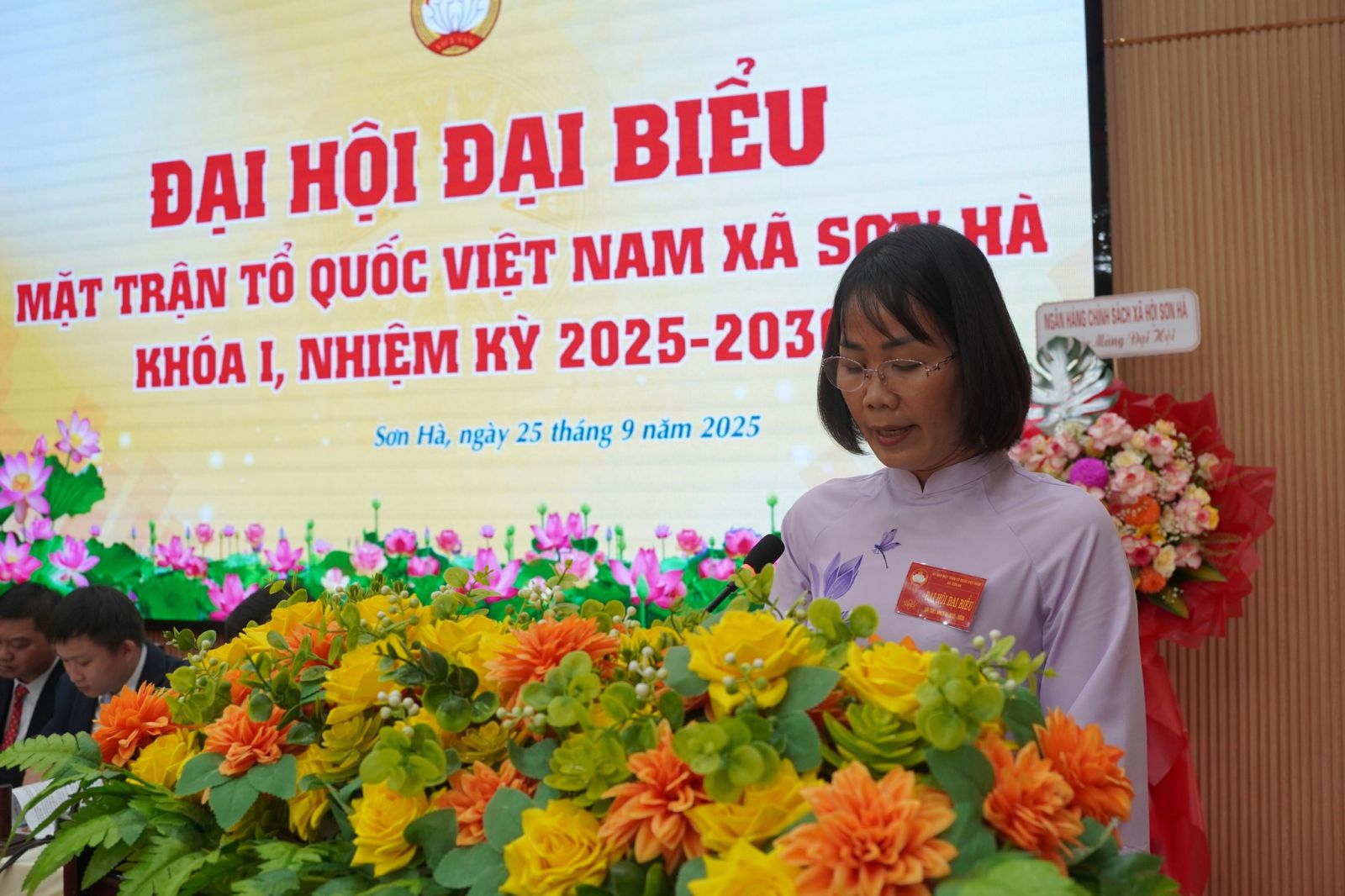 Sáng 25/9/2025, Ủy ban Mặt trận Tổ quốc Việt Nam xã Sơn Hà, long trọng tổ chức Đại hội đại biểu MTTQ xã Sơn Hà lần thứ I, nhiệm kỳ 2025 - 2030. Dự Đại hội có các đồng chí trong Ban Thường trực Ủy ban MTTQ Việt Nam tỉnh; ở xã có Bí thư Đảng uỷ, Chủ tịch HĐND xã Trần Văn Luật, Phó Bí thư, Chủ tịch UBND xã Phan Anh Quang; các Phó Chủ tịch HĐND, UBND xã Sơn Hà, lãnh đạo các cơ quan, đơn vị xã và cơ quan, đơn vị Trung ương, Tỉnh đóng trên địa bàn xã; 120 đại biểu tiêu biểu đại diện cho các tầng lớp Nhân dân, các dân tộc trong xã.
