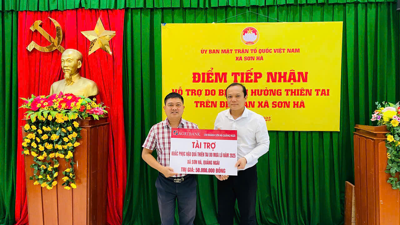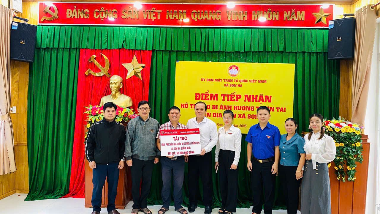 Sáng ngày 19/11/2025, Ủy ban MTTQ Việt Nam xã Sơn Hà đã tiếp nhận 50 triệu đồng từ Ngân hàng Agribank Quảng Ngãi, chi nhánh Sơn Hà ủng hộ nhân dân trên địa bàn xã khắc phục hậu quả do mưa bão gây ra.