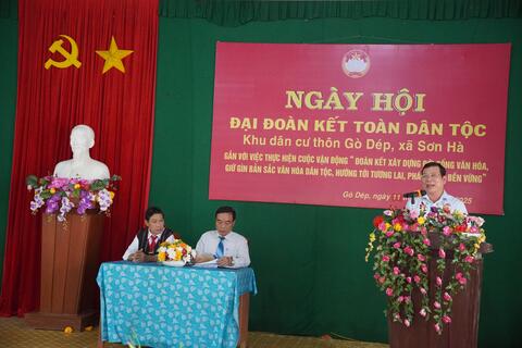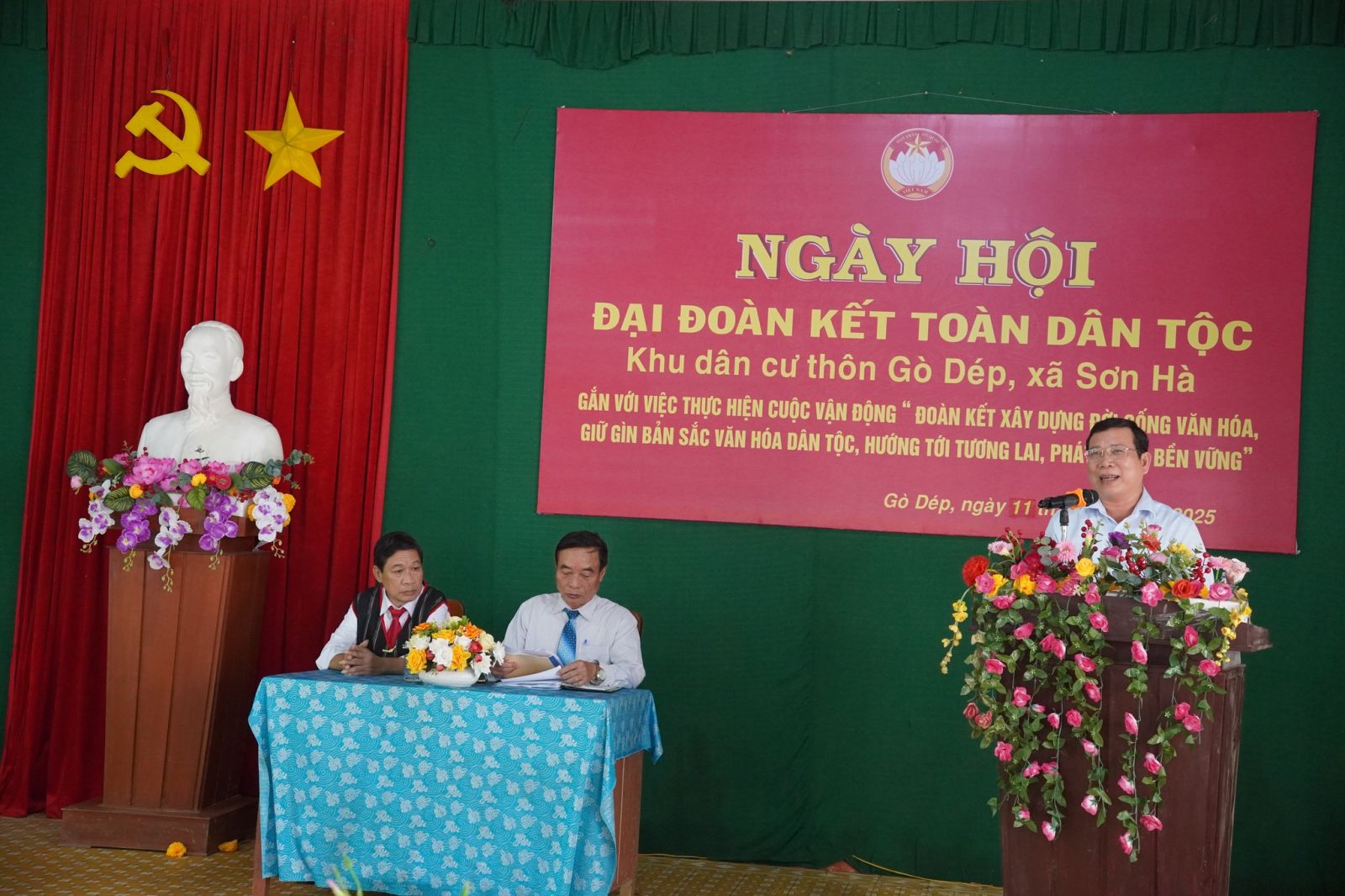Phát biểu tại Ngày hội, Bí thư, Chủ tịch HĐND xã Trần Văn Luật, hết sức vui mừng về những thành tích mà Khu dân cư đã đạt được. Đặc biệt, trong năm 2025 thôn Gò Dép đã phát huy tốt tinh thần đoàn kết, tương thân tương ái, giúp đỡ lẫn nhau trong phát triển kinh tế với nhiều ngành nghề, chuyển giao và áp dụng tiến bộ khoa học kỹ thuật vào các lĩnh vực sản xuất, kinh doanh nhằm nâng cao thu nhập, kinh tế hộ gia đình, góp phần ổn định đời sống nhân dân, qua đó đã có nhiều gia đình xây dựng nhà mới, khang trang, sạch đẹp, biết cách tự vươn lên để phát triển kinh tế hộ gia đình. Ngoài ra, triền khai thực hiện tốt phong trào toàn dân bảo vệ an ninh Tổ quốc gắn với đảm bảo an ninh chính trị, trật tự an toàn xã hội trên địa bàn thôn.