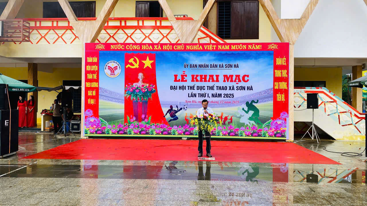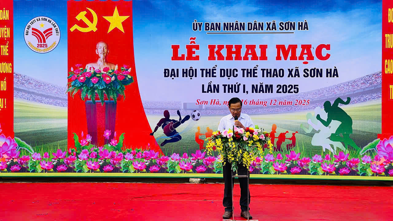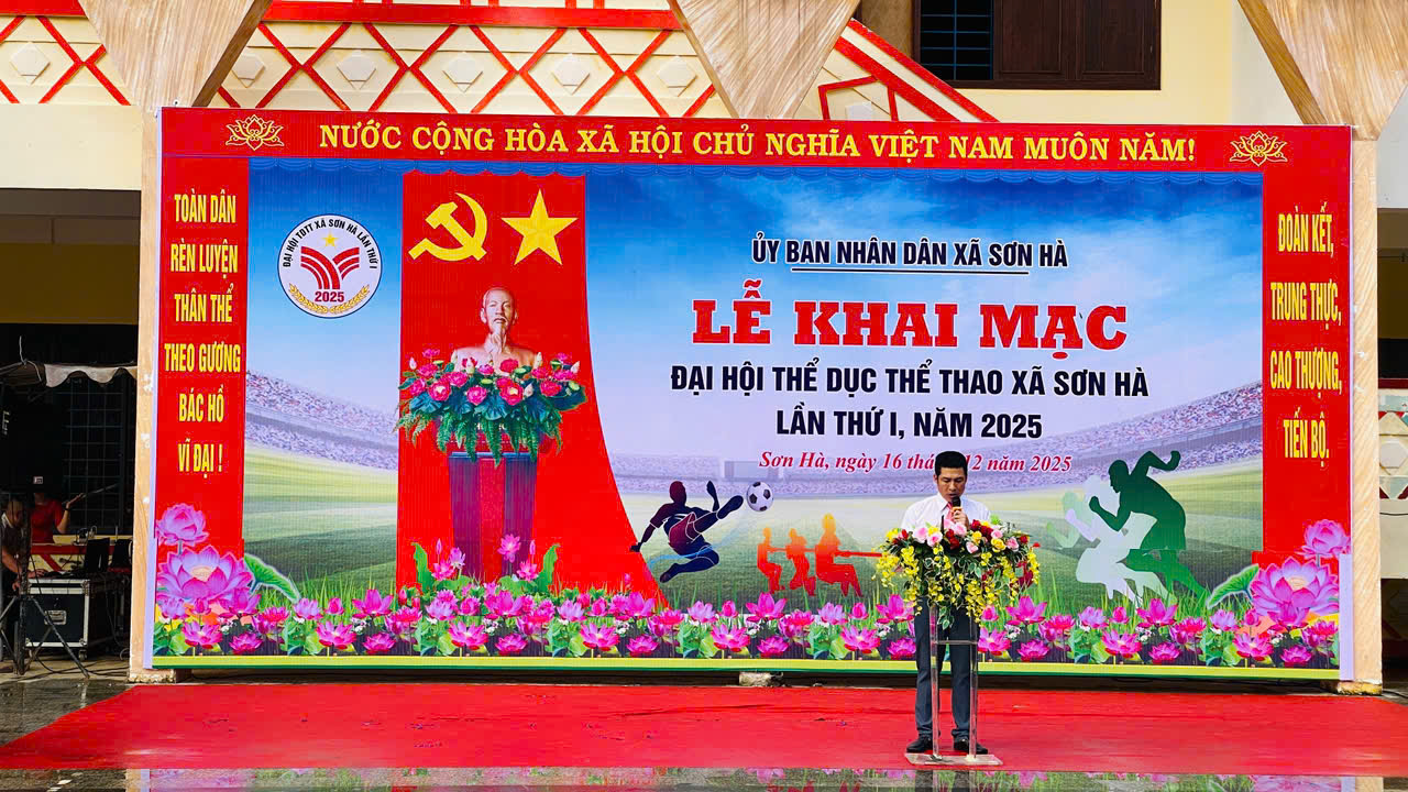 Hòa chung không khí thi đua sôi nổi chào mừng các ngày lễ lớn của đất nước, sáng ngày 16/12, xã Sơn Hà long trọng tổ chức Đại hội thể dục, thể thao lần thứ nhất, năm 2025. Tham dự buổi lễ ở tỉnh có đồng chí Nguyễn Liên Phương – Phó Giám đốc Sở Văn hóa Thể thao và Du lịch tỉnh cùng các đồng chí đi trong đoàn. Ở xã có đồng chí: Trần Văn Luật, Bí thư Đảng uỷ, Chủ tịch HĐND xã; Đinh Trường Sơn, Phó Bí thư Thường trực Đảng uỷ; Phan Anh Quang, Phó Bí thư, Chủ tịch UBND xã; các Phó Chủ tịch HĐND, UBND xã; đại diện lãnh đạo các cơ quan, đơn vị, hội đoàn thể, lãnh đạo các trường học, 10 đoàn vận động viên, trong đó; 08 đoàn đại diện cho 20 thôn; 02 đoàn đại diện cho khối Trường học và Liên cơ quan. cùng đông đảo nhân dân, cổ động viên đến xem và cổ vũ. Đây là sự kiện có ý nghĩa quan trọng, góp phần thúc đẩy phong trào thể dục thể thao và nâng cao đời sống văn hóa - xã hội của nhân dân địa phương.