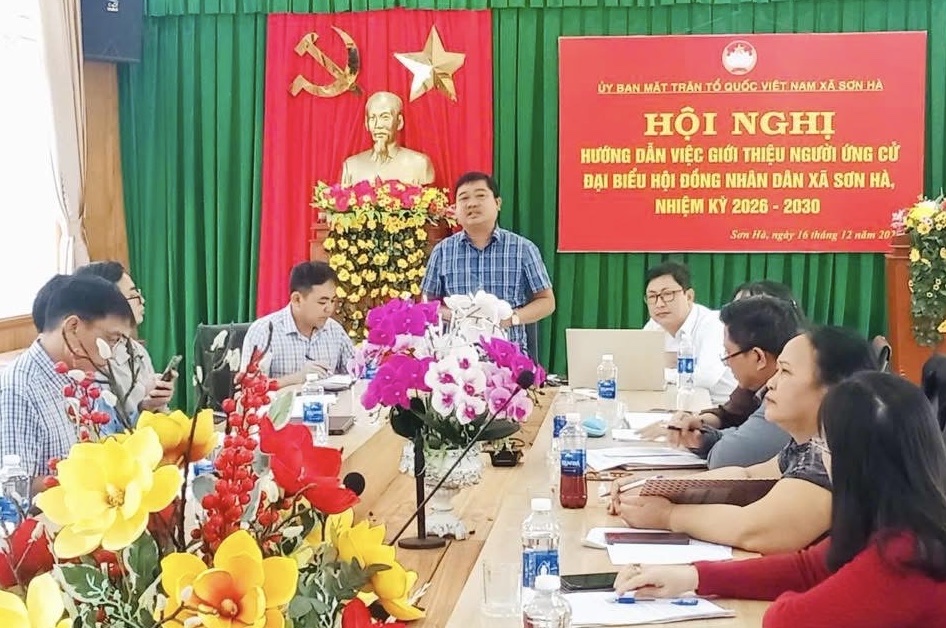 Chiều ngày 16/12/2025, Ủy ban MTTQ Việt Nam xã Sơn Hà tổ chức Hội nghị hướng dẫn việc giới thiệu người ứng cử đại biểu Hội đồng nhân dân xã Sơn Hà khóa II, nhiệm kỳ 2026–2031. Dự hội nghị có các đồng chí: Đinh Trường Sơn, Phó Bí thư Thường trực Đảng ủy xã; Bùi Văn Ba, PCT Thường trực UBND xã; Đinh Văn Đinh, Chủ tịch UBMTTQVN xã; Đinh Văn Một, PCT HĐND xã; Lãnh đạo Ủy ban bầu cử xã; Ban Thường trực Ủy ban MTTQ Việt Nam xã; đại diện các tổ chức chính trị – xã hội, các cơ quan, đơn vị và Ban Công tác Mặt trận các thôn.